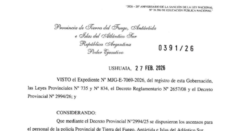 04/03 | Decreto 0391/26: El Gobierno de Tierra del Fuego dispuso ascensos en la Policía por equidad y con retroactividad a enero de 2026