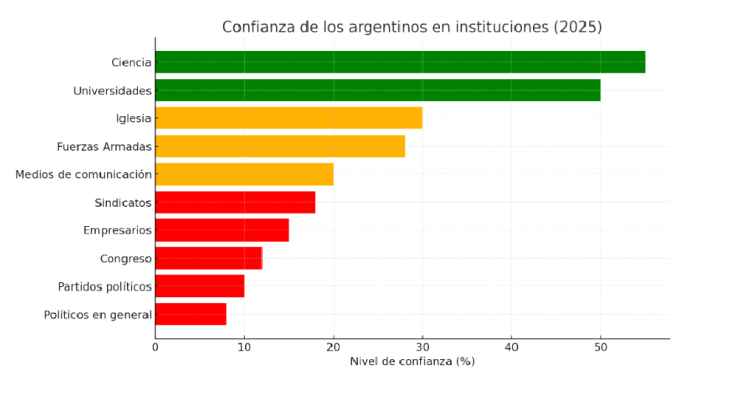 En contraste, estudios internacionales como el Edelman Trust Barometer 2025 muestran que los argentinos confían más en empresas (54%) y ONG (54%) que en el gobierno o los medios (42%). Es decir, mientras la política pierde credibilidad, otros actores sociales ganan espacio como referentes de confianza.