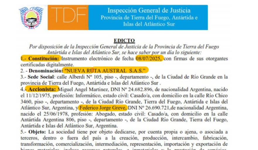 RÍO GRANDE.- El legislador Federico Greve, una de las figuras más importantes de FORJA y hombre de confianza del gobernador Gustavo Melella, aparece en el registro de una nueva sociedad con un margen de acción tan amplio que hace ruido en el ambiente político. El edicto publicado el 8 de julio de 2025 por la Inspección General de Justicia (IGJ) confirmó la creación de Nueva Ruta Austral S.A.S., donde Greve figura como administrador suplente, junto a Miguel Ángel Martínez como administrador titular.