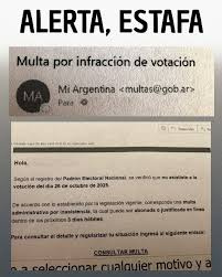 En las últimas horas, cientos de usuarios reportaron haber recibido un correo electrónico con el remitente multas@multas.gov.ar, que asegura provenir del Gobierno nacional. En el mensaje, se intima al destinatario a pagar una multa por no haber emitido su voto en las elecciones, bajo amenaza de sanciones si no se realiza el pago dentro de los próximos tres días hábiles.