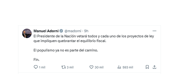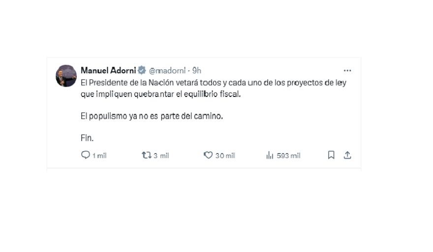 “El Presidente de la Nación vetará todos y cada uno de los proyectos de ley que impliquen quebrantar el equilibrio fiscal. El populismo ya no es parte del camino. Fin.”