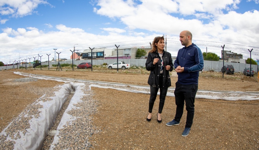 Río Grande.- La secretaria de Obras Públicas, Silvina Mónaco, recorrió junto al gerente de la Agencia de Deportes, Cultura y Juventud, Sebastián Bendaña, los trabajos en la Cancha de Césped Sintético del Centro Deportivo Municipal.