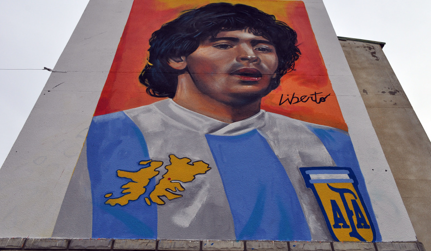 La intervención artística trasciende la mera admiración futbolística. Liberto, que si bien está radicado en Córdoba tiene sus orígenes en Sierra Grande (Patagonia), seleccionó una de las imágenes más recordadas de Maradona, pero le sumó una carga emocional que interpela directamente al sentir fueguino. El astro viste la camiseta de la Selección Argentina de 1982, y el diseño incorpora un detalle de soberanía: la silueta de las Islas Malvinas junto a la ubicación del Cementerio de Darwin.