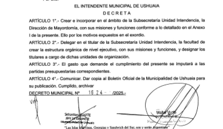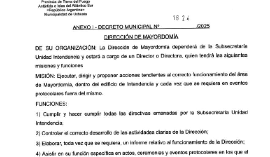 USHUAIA — En tiempos de crisis y mientras los vecinos reclaman soluciones a problemas básicos, el intendente Walter Vuoto sorprendió a propios y extraños con la creación de una nueva dependencia municipal: la Dirección de Mayordomía. Sí, como suena: una estructura dedicada a que todo funcione “bien” en Intendencia y a asistir en actos y ceremonias protocolares, lo que algunos ya empiezan a llamar con sorna “el área de mayordomos”.