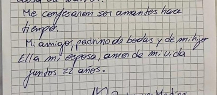 “Esta madrugada del 18 de octubre encontré a Walter Vuoto y Laura Ávila en la habitación matrimonial de la casa de Walter. Me confesaron ser amantes hace tiempo. Mi amigo, padrino de bodas y padrino de uno de mis hijos. Ella, mi esposa y el amor de mi vida”, afirma el escrito que dejó Rodríguez. Firma con su nombre y su DNI.