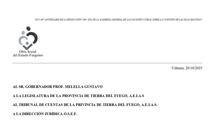 USHUAIA.- Un inesperado cortocircuito interno sacude a la Obra Social del Estado Fueguino (OSEF). El Vocal electo por los afiliados pasivos, José María Martín, presentó un escrito ante el gobernador Gustavo Melella, la Legislatura y el Tribunal de Cuentas, quejándose de la decisión administrativa que lo designaba como presidente interino para cubrir la licencia de la titular, Mariana Silvina Hruby. Martín sostiene que dicha designación es "irregular" y que la Ley Provincial Nº 1071 indica taxativamente quién debe ocupar ese lugar.