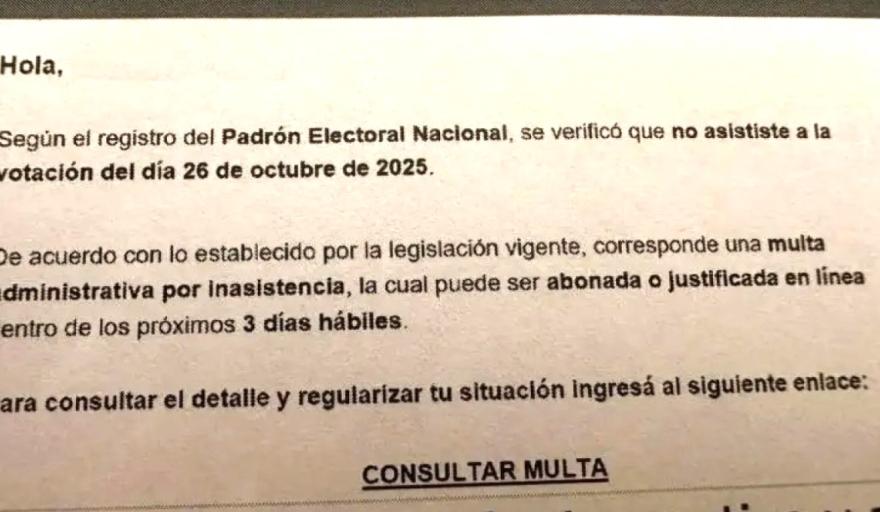 Desde la Justicia Nacional Electoral aclararon que no se envían correos ni mensajes de texto para notificar infracciones, y que la única vía oficial para verificar si corresponde abonar una multa es el sitio infractores.padron.gov.ar.