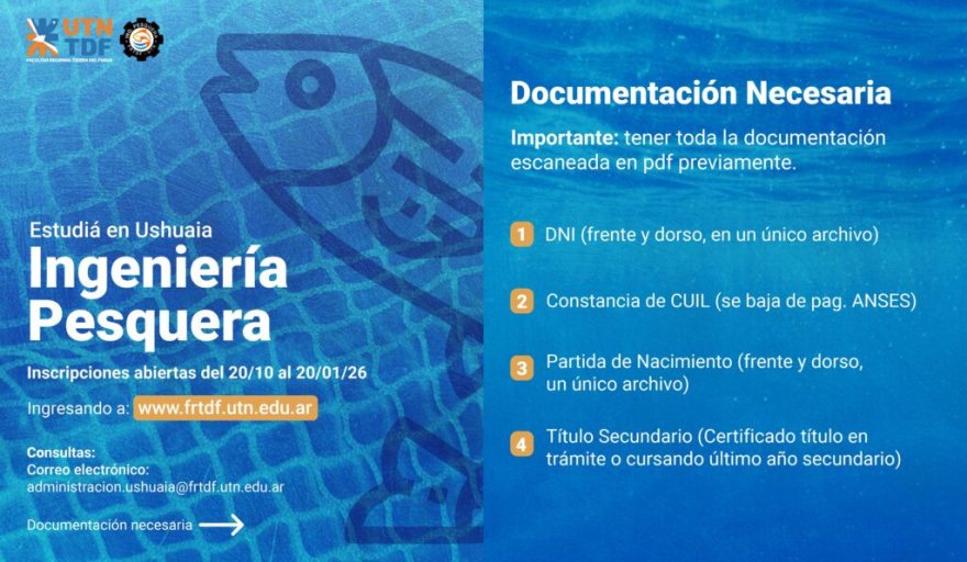 USHUAIA.- La Facultad Regional Tierra del Fuego (FRTDF) de la Universidad Tecnológica Nacional (UTN) oficializó la apertura de las inscripciones para cursar la carrera de Ingeniería Pesquera en su sede de esta ciudad.