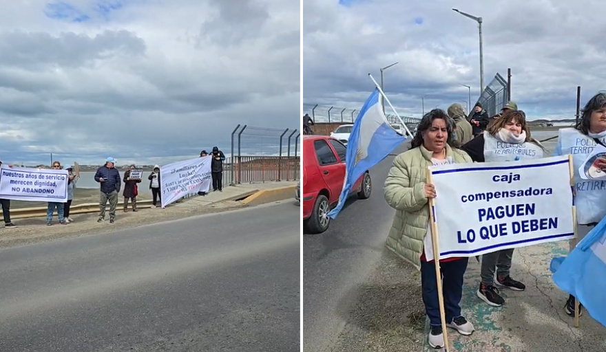 RIO GRANDE.- Familias y ex miembros de la Policía Territorial volvieron este lunes, a manifestarse en el Puente Mosconi de esta ciudad. El reclamo se produce luego de cumplirse seis meses sin que se abonen los haberes y el aguinaldo adeudados a los ex efectivos. La situación escaló la preocupación tras un reciente fallo judicial que dio la razón a la Caja Compensadora, poniendo en tela de juicio el futuro de los aportes y derechos de los retirados tras décadas de servicio.