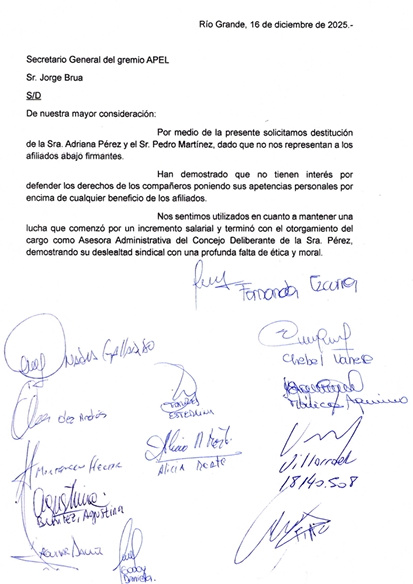 El reclamo, que generó cruces en reuniones y discusiones que han enrarecido el ámbito laboral, quedó plasmado en una nota dirigida al secretario general del gremio, Jorge Brua, donde los trabajadores sostienen que ambos dirigentes “no nos representan a los afiliados abajo firmantes” y denuncian que priorizaron intereses personales por sobre los derechos colectivos.