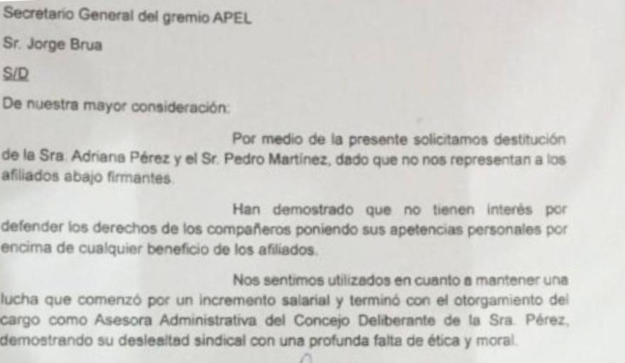 “Nos sentimos utilizados en cuanto a mantener una lucha que comenzó por un incremento salarial y terminó con el otorgamiento del cargo de Asesora Administrativa del Concejo Deliberante a la Sra. Pérez”, indica la nota.