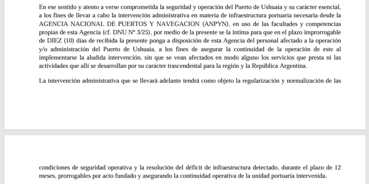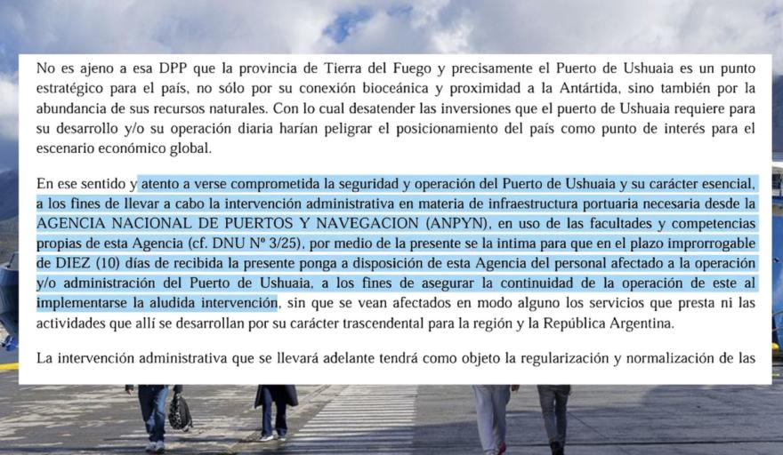 En el extracto de la comunicación de la ANPYN se establece de manera explícita que, ante el riesgo de verse comprometida la seguridad y la operación del Puerto de Ushuaia, se pone en marcha una intervención administrativa en materia de infraestructura portuaria.