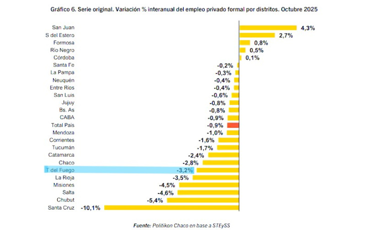 El caso de Tierra del Fuego no es aislado, sino que se inscribe en una crisis laboral más amplia que golpea a toda la Patagonia, especialmente en su franja sur. Junto con Santa Cruz y Chubut, la provincia forma parte del grupo de distritos que acumulan las mayores pérdidas de empleo privado formal en los últimos meses.