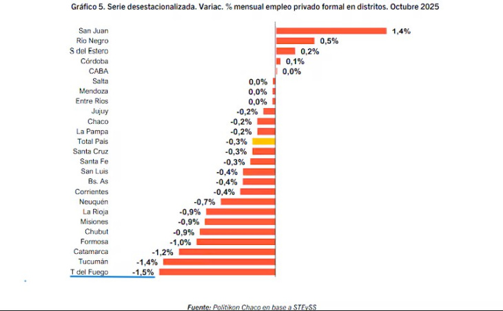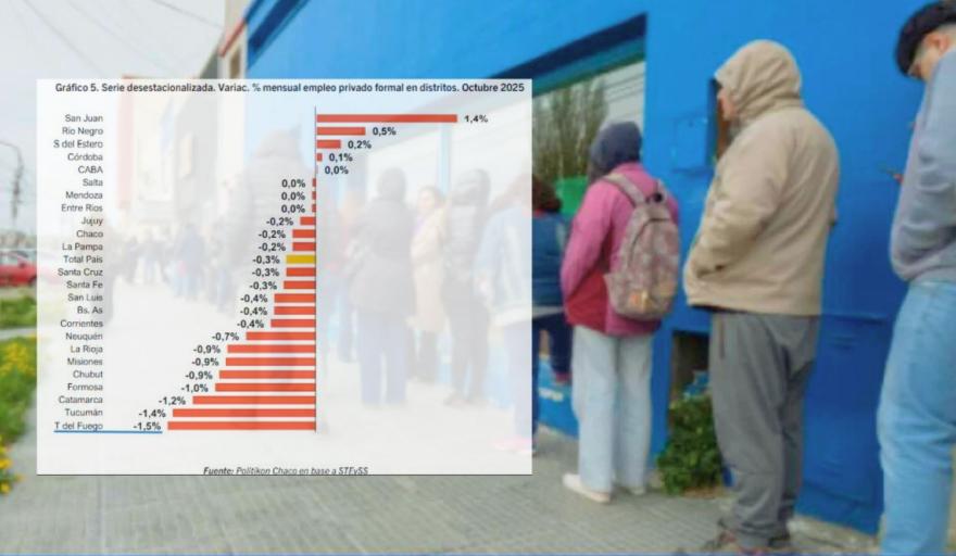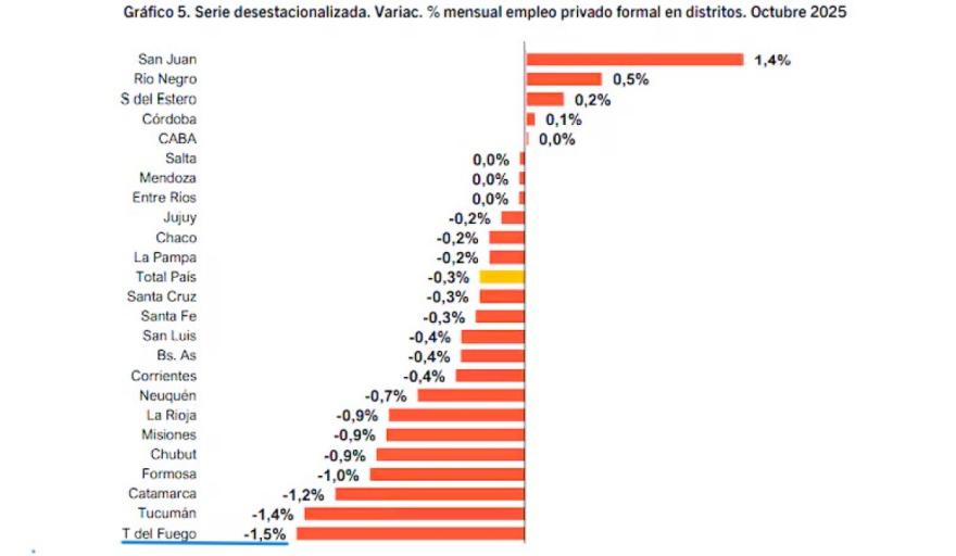 A nivel país, el empleo privado formal atraviesa un proceso de deterioro generalizado. Solo entre junio y octubre de 2025, se perdieron más de 71.000 puestos de trabajo privados, con una caída mensual promedio del 0,3%. En total, dieciséis provincias registraron bajas, mientras que apenas un puñado logró sostener o recuperar empleo en algún período puntual.