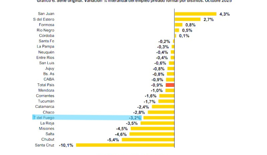 Los datos muestran que durante 2025 el empleo privado en Tierra del Fuego cayó de manera sostenida, ubicando a la provincia entre las jurisdicciones con peor desempeño del país. Esta situación se agrava por la incertidumbre que atraviesa el sector industrial, afectado por cambios en el régimen económico, caída de la demanda y un escenario macroeconómico adverso.