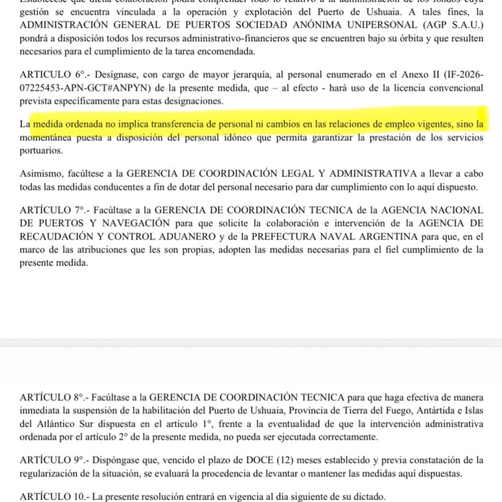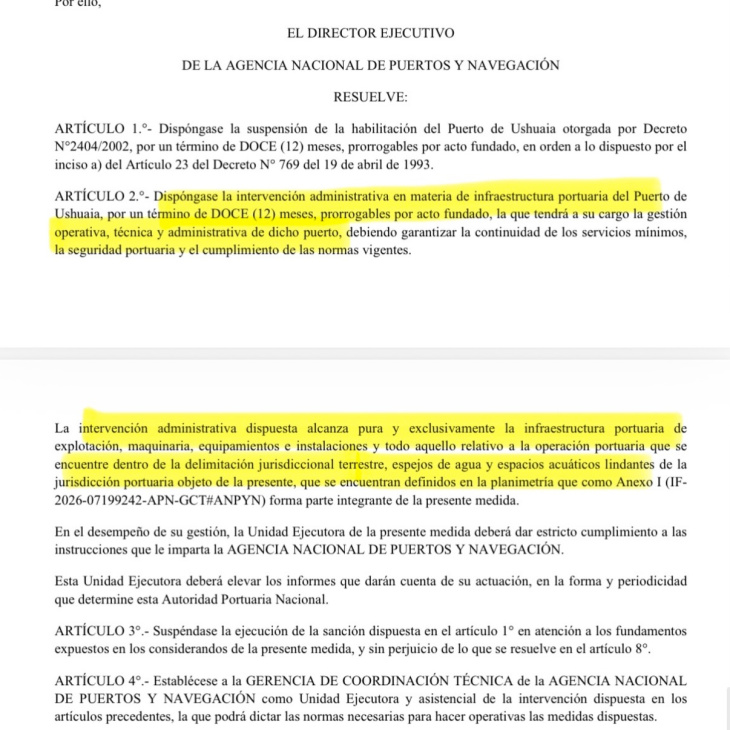 Frente a este escenario, el Gobierno nacional dispuso la intervención administrativa del Puerto de Ushuaia por un plazo de doce meses, prorrogables por acto fundado, asumiendo la gestión operativa, técnica y administrativa con el objetivo de garantizar la seguridad, la continuidad de los servicios y el ordenamiento integral del puerto.