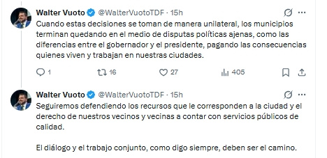 El malestar no tardó en trasladarse al plano político. El intendente de Ushuaia, Walter Vuoto, utilizó su cuenta oficial en X para expresar su rechazo a la medida y dejar en evidencia el quiebre del discurso de unidad.