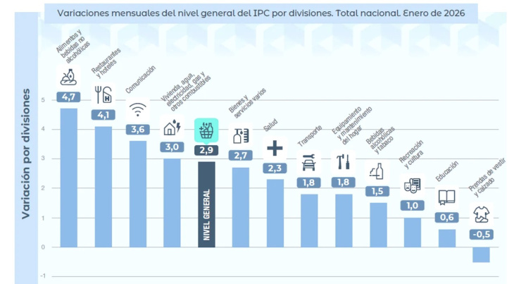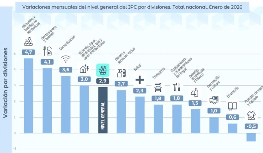 La división que más aumentó durante enero fue Alimentos y bebidas no alcohólicas, con una suba del 4,7%, muy por encima del promedio general. Este rubro volvió a ser el principal responsable del incremento mensual, especialmente por los aumentos en Carnes y derivados y en Verduras, tubérculos y legumbres, productos esenciales en la canasta básica.