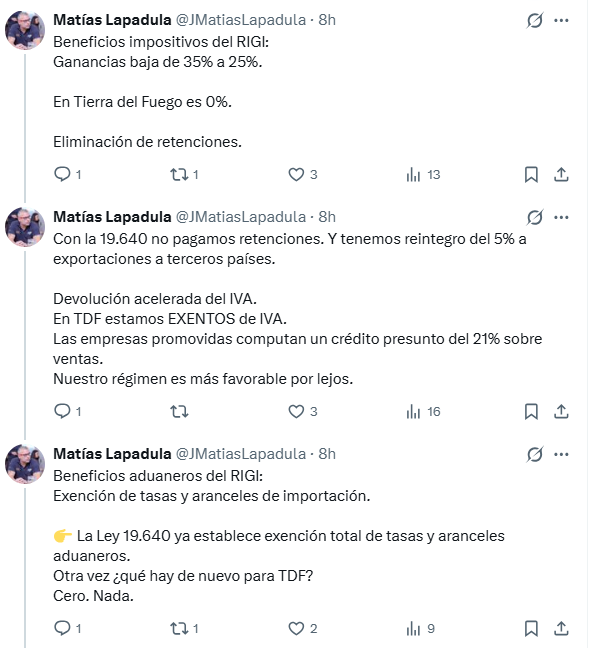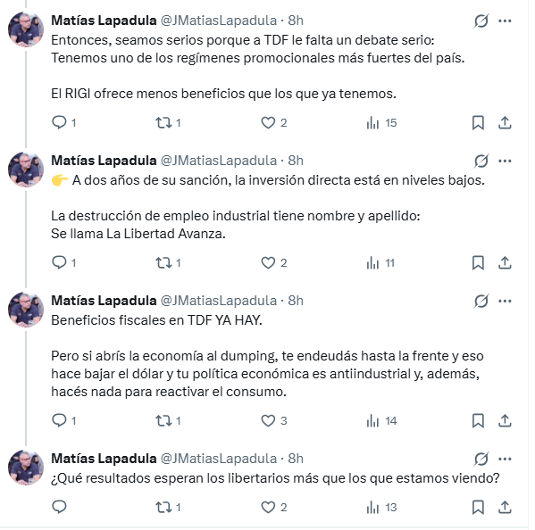 A través de una serie de publicaciones públicas, Lapadula cuestionó la insistencia de La Libertad Avanza para que la provincia adhiera al régimen y rechazó la idea de que la destrucción de puestos de trabajo sea consecuencia de no haberlo hecho. “Quieren instalar que la destrucción de empleo fueguino es porque no adherimos”, expresó. Y agregó: “Las medidas de Javier Milei hacen caer mes a mes el uso de la capacidad instalada y el empleo industrial”.