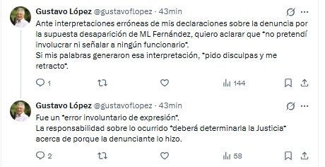 “Evidentemente me mal expresé, porque no digo que me malinterpretaron, me mal expresé yo con respecto a la chica Fernández que había denunciado su desaparición inexistente”, sostuvo López al comenzar su aclaración.