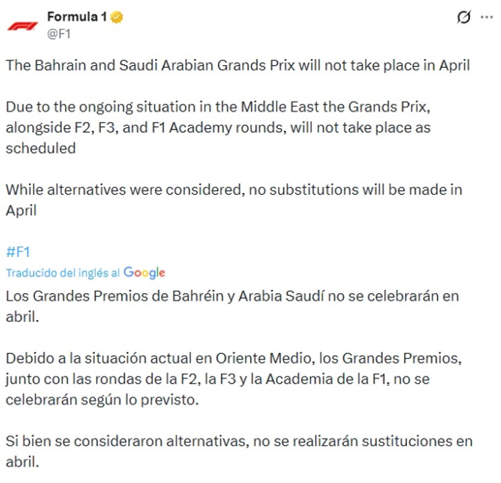 “Los Grandes Premios de Bahréin y Arabia Saudí no se celebrarán en abril. Debido a la situación actual en Oriente Medio, los Grandes Premios, junto con las rondas de la F2, la F3 y la Academia de la F1, no se celebrarán según lo previsto. Aunque se consideraron alternativas, no se realizarán sustituciones en abril”.