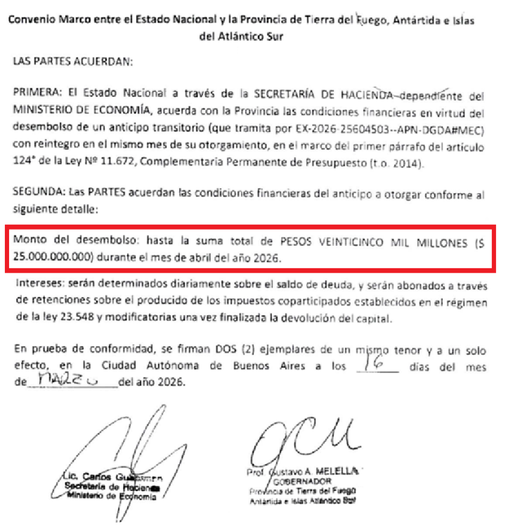 El acuerdo, firmado entre la Nación y la Provincia, establece que se trata de un anticipo transitorio, que deberá ser reintegrado en el corto plazo mediante retenciones automáticas sobre los recursos coparticipables.