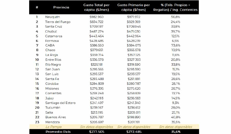 RÍO GRANDE.- El informe de Coyuntura Nacional de marzo de 2026 arroja datos determinantes sobre la realidad económica de Tierra del Fuego. Con un gasto público mensual de 834.722 pesos por cada habitante, la provincia se ubica muy por encima del promedio de las jurisdicciones argentinas, que promedian los 277.505 pesos. Este nivel de inversión estatal sólo es superado por Neuquén, mientras que la isla mantiene una brecha significativa respecto a provincias como Buenos Aires o Mendoza, donde el gasto por persona es casi cuatro veces menor.