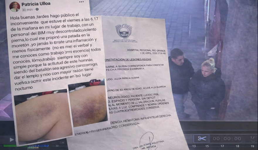 17:00 |Una trabajadora de seguridad identificada como Patricia Susana Ulloa denunció haber sido agredida durante la madrugada del viernes en el boliche QUIU, en la ciudad de Río Grande. Según relató, el hecho ocurrió alrededor de las 6:17, cuando un hombre que sería integrante del BIM (Batallón de Infantería de Marina) le propinó una patada en la pierna mientras cumplía sus funciones.
