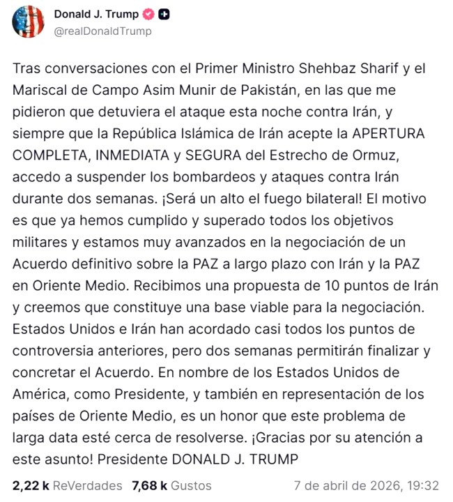 La decisión llegó cuando restaba poco más de una hora para el vencimiento de un ultimátum que amenazaba con un ataque de magnitud histórica. “Será un alto el fuego bilateral”, afirmó Trump, tras aceptar una propuesta impulsada por Pakistán, que también incluye a Israel y Líbano.