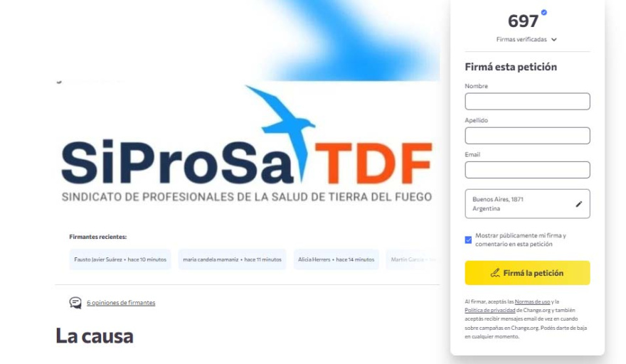 Con la intención de dar visibilidad a la protesta, invitaron a los vecinos a adherir a la petición digital bajo la premisa de asegurar un futuro saludable para todos. “Así podremos luchar por un sistema de salud pública que realmente sirva a las necesidades de toda la comunidad de Tierra del Fuego”, remarcan en el texto de la campaña. El gremio busca que la iniciativa se viralice para fortalecer su postura ante las autoridades gubernamentales.