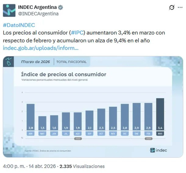 El número no es menor: implica el fin de la “meseta” del 2% que se había sostenido durante enero y febrero (2,9% en ambos casos) y vuelve a instalar la preocupación sobre la dinámica inflacionaria en la Argentina.