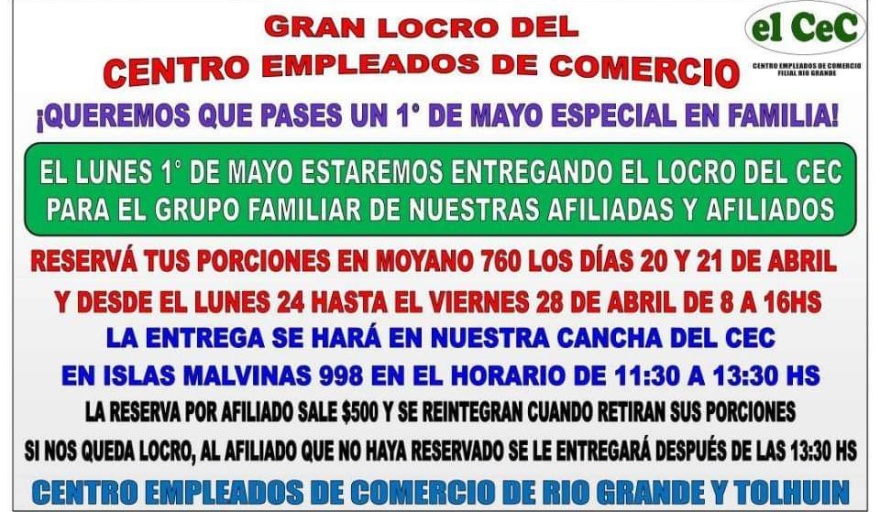 Como todos los años, el Centro de Empleados de Comercio de Río Grande entregará el locro tradicional este Primero de Mayo, entre las 11:30 y las 13:30 en el gimnasio del gremio, ubicado en Islas Malvinas 998 de ésta ciudad.