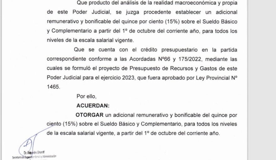 Más adelante, la acordada menciona que “producto del análisis de la realidad macroeconómica y propia de este Poder Judicial, se juzga procedente establecer un adicional remunerativo y bonificable del quince por ciento (15%) sobre el Sueldo Básico y Complementario a partir del 1° de octubre del corriente año, para todos los niveles de la escala salarial vigente”.
