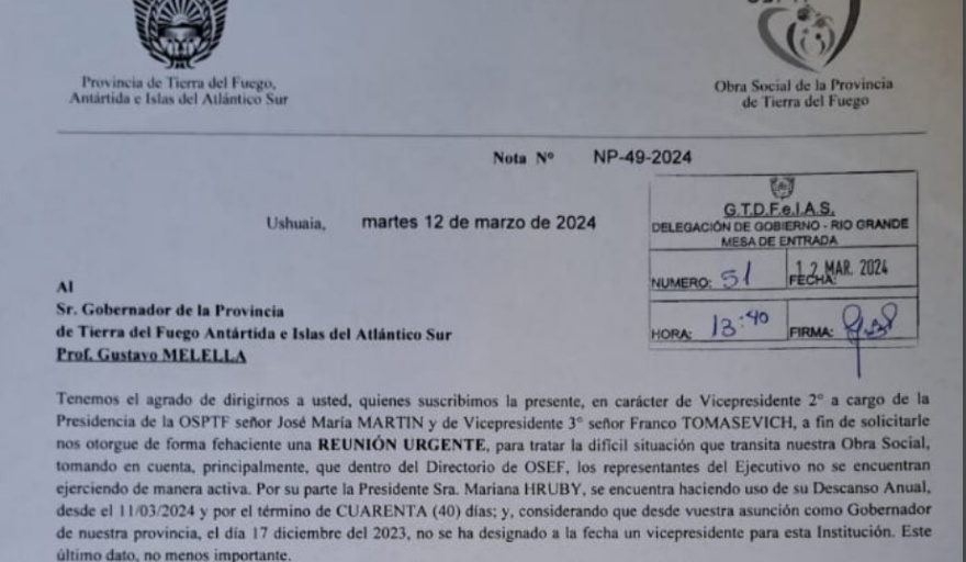 En ese mismo escrito “Se advierte la acefalía de autoridades por parte del Ejecutivo en la obra social, por un lado, la presidenta de la Obra Social, Mariana Hruby, se encuentra haciendo uso de su descanso anual por el término de 40 días; y por otro lado, que desde el 17 de diciembre del 2023 que el Gobernador Gustavo Melella no ha designado un vicepresidente”, remarcaron desde el sindicato docente.
