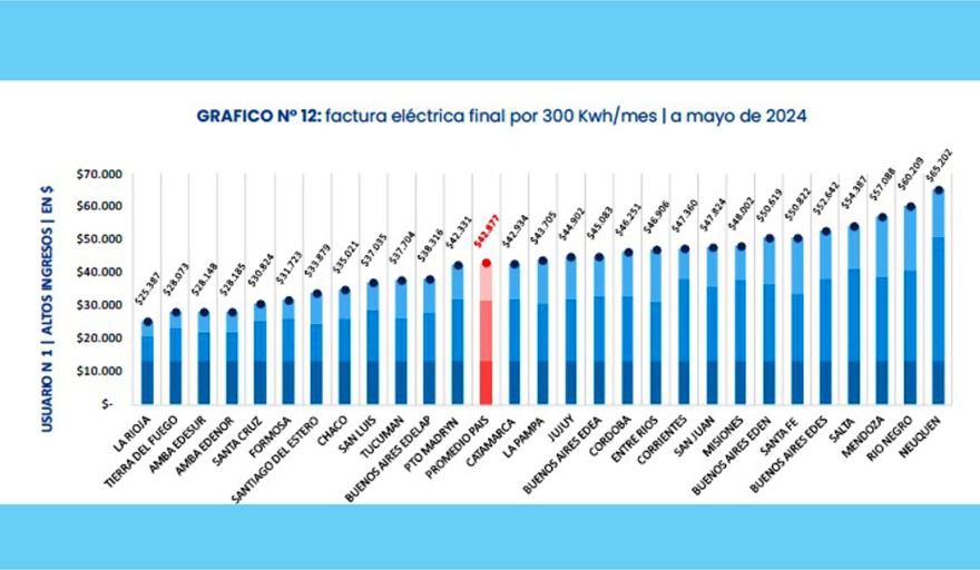 Río Grande.- La comparación de los cuadros tarifarios de consumo eléctrico entre jurisdicciones indica que, ante igual consumo, las facturas finales de luz más bajas se encuentran La Rioja, Tierra del Fuego y el AMBA para los cuadros tarifarios tipo N 1.