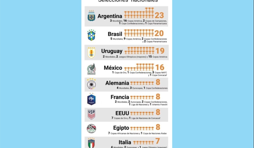 Argentina (23): 3 Mundiales, 16 Copas América, 2 Copas de Campeones, 1 Copa Confederaciones y 1 Copa Panamericana