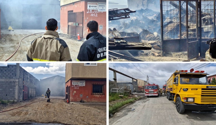 En el lugar, la División de Bomberos de la Policía de Tierra del Fuego trabajó intensamente para contener la situación. El desafío principal radicaba en la gran cantidad de fardos de cartón almacenados, un material altamente inflamable que dificulta la extinción total del fuego.