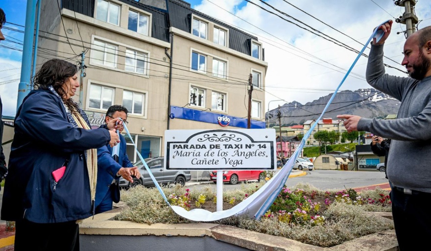 Ushuaia.- La Municipalidad de Ushuaia acompañó la inauguración del cartel que denomina “María de los Ángeles Cañete Vega” a la parada de taxis ubicada en la intersección de las calles Piedrabuena y Pasaje Tomás Beban, en homenaje a la taxista asesinada en el año 1998.